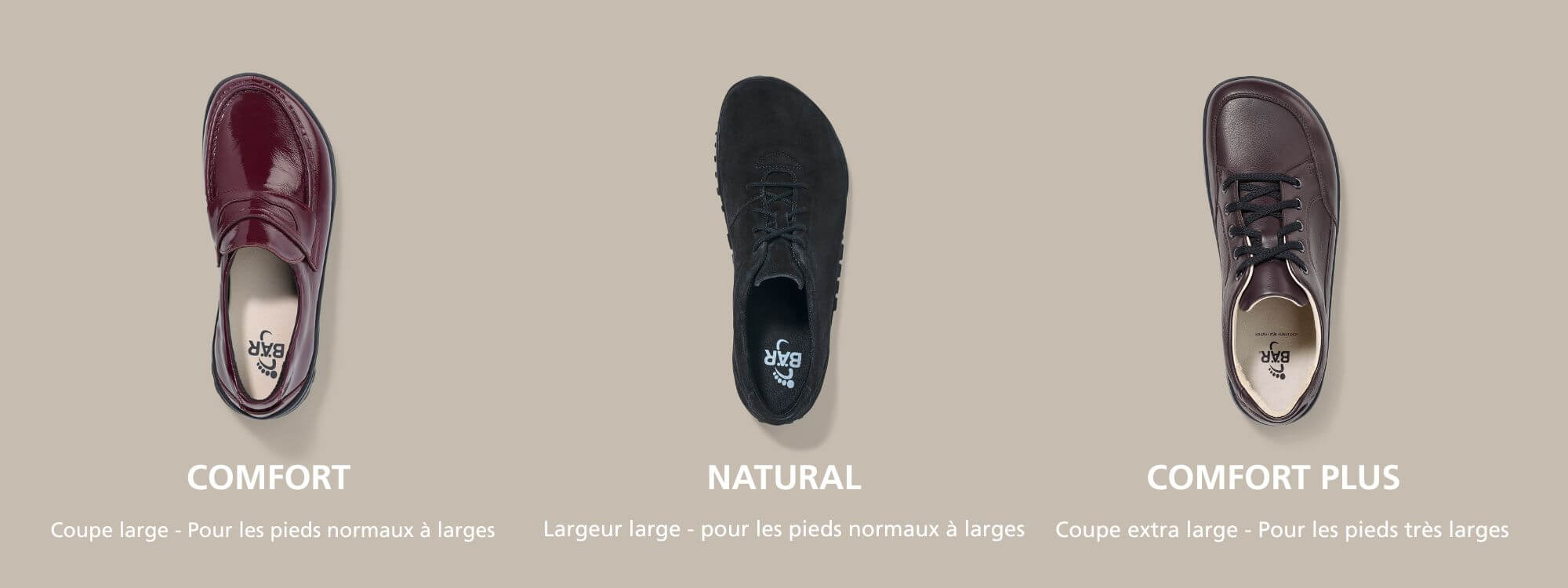 Les chaussures normales sont généralement étroites, ce qui signifie que la chaussure a la même largeur au niveau du talon qu'autour des orteils. Cela met l'accent sur la stabilité et le soutien des orteils. Dans les chaussures BÄR, en revanche, la stabilité et le soutien se concentrent sur le talon. Nos modèles sont conçus avec une coupe étroite à l'arrière de la chaussure, ce qui vous permet de profiter pleinement de l'espace pour les orteils à l'avant, sans ressentir de pression.